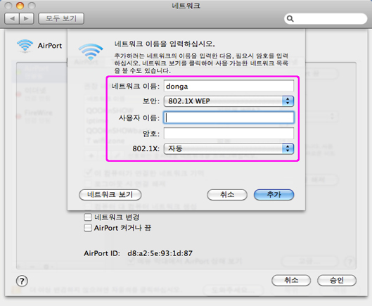 4. <그림4>와 같은 창이 나타나면, ‘네트워크 이름’ 과 ‘보안’ , ‘사용자 이름’ 및 ‘암호’를 입력 한 후, [추가]을 선택합니다 <그림 4> 네트워크 설정 화면